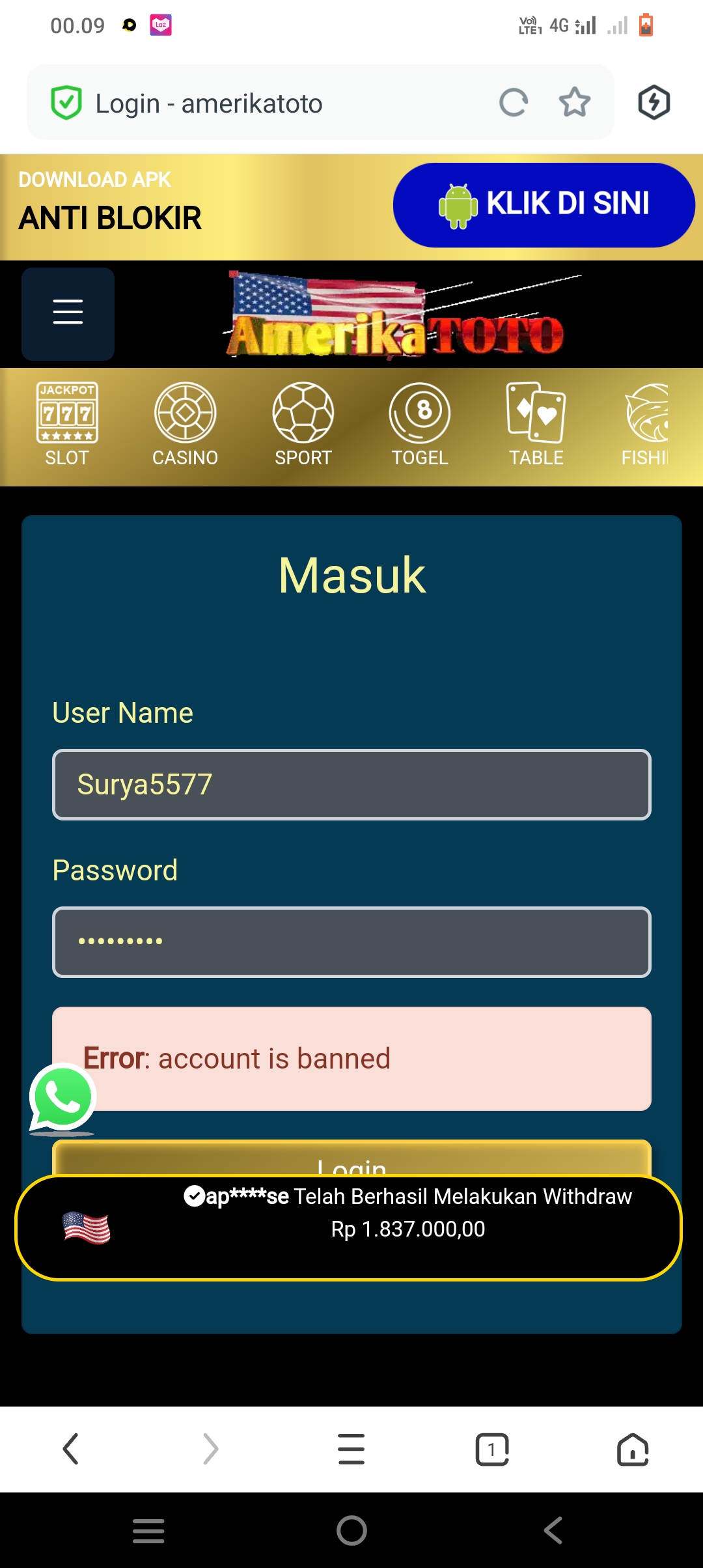 Aku kena di america toto, cuma wd 400rb akun diblokir, jgn mau main di americatoto hati2 main di americatoto