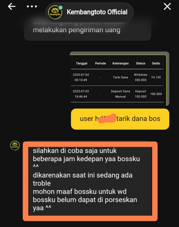 mohon di bantu boss saya wd 4 juta tidak di proses dengan alasan kendala pada bank tapi saldo di kembalikan ke akun dan saya wd lagi 2 juta belum juga di proses mohon bantuan nya boss ku